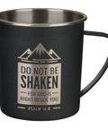 Head for adventure with the Do Not Be Shaken Black Camp-style Stainless Steel Mug tied to your backpack and have the confidence that God is with you through all your hilltop and valley experiences.