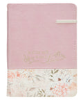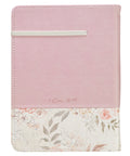 The faux leather cover of the classic journal is divided into thirds. The two top thirds are covered in smooth pink faux leather that connects to the bottom third's pink floral faux leather panel with a double row of topstitching. The sentiment is presented in gold-foiled letters accented by gold-foiled floral patterns.