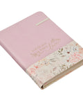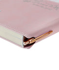 Each page is lined and features a Scripture verse at the bottom. A pink satin ribbon marker is attached to mark your place. The pages are Smyth-sewn, allowing the journal to open completely flat without damage to the spine. A nifty and unique feature of this journal is the notched compartment built into the spine cavity that accommodates a pen.