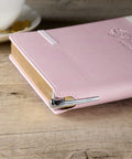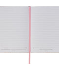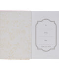 A pink elastic band closure extends horizontally across the front and back covers of the journal to keep it closed, and gilt edging on the page edges gives a subtle shimmer to the design. A presentation page can be found at the front of the journal. This page can be personalized when it is given as a gift.