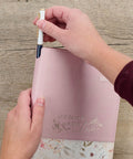 Stop losing your pen by slipping it into the cover of the Done in Love Pink Floral Classic Journal with Elastic Closure and Pen Holder. This journal is for the serious journaler in your life who likes to keep all her journaling necessities neatly in one place.