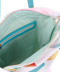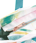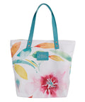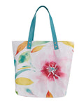 With the flair of springtime in bloom, the canvas tote is adorned with large watercolored pink daisies surrounded by leaves in pastel teal, chartreuse, and orange. The sentiment is captured by an appliquéd teal faux leather patch and is presented in rose gold-foiled letters.