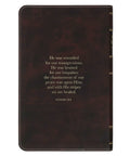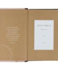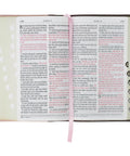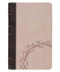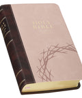 The soft pink cover is accented with an espresso brown spine and back that adds depth and contrast. A crown of thorns design, that points to the heart of the gospel message, is heat-debossed into the lower right corner of the front cover. The title and version name are stamped in gold foil above the design.