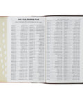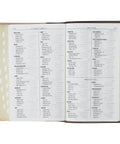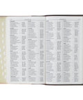 The spine features gold-foiled faux spine ribs, title, and version name. Gold gilt-edged pages shimmer at the page edges, where you will also find a thumb index. A matching satin ribbon marker will hold your place once you locate it with the index. To personalize the Bible when you give it as a gift, a presentation page at the front has space to record names and an occasion. A lay-flat spine ensures the book stays open for easy reading or study.