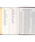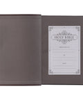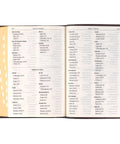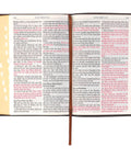 Topstitching along the edges of the faux leather Bible adds strength and durability. The flexcover Bible with its Smyth-sewn binding opens completely flat without damaging the spine. Black thumb-indexing tabs offer an easy way to navigate your Bible, and the dark brown satin ribbon will keep your place once you find it. Gilt-edged pages add a little luxury to an understated design.