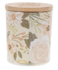 The clear glass jar is adorned in a delicate cream and blush floral wrap that is layered with sage green leaves. On the wrap, large, hand-painted blooms surround a white block-style label in the center that showcases the Scripture verse in a hand-lettered, pink script.