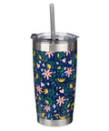 The Everything Beautiful Stainless Steel Travel Mug is decorated with multicolored pastel flowers, hearts, and leaves over a matte navy background. Two stainless steel bands are exposed at the top and the bottom of the travel mug, and the sentiment, taken from Ecclesiastes 3:11 is laser engraved to appear in a silver handwritten script.