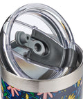 Hand washing is recommended to preserve this vibrant mug, and it is not dishwasher, microwave, or freezer safe. It holds a generous 18 fluid ounces of hot or cold liquid and is plastic-free. The smooth stainless steel is mold and bacteria resistant and maintains your drink at the perfect temperature. There is no handle, so the travel mug fits easily in your car or stroller's cup holder.