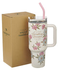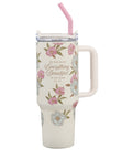 The Everything Beautiful Whimsical Blooms 40 oz Stainless Steel Travel Tumbler is part of the Everything Beautiful Whimsical Blooms Collection, designed to bring elegant, feminine designs to everyday items to showcase the beauty of everything God has made. Consider gifting this tumbler alongside another item from this collection, such as a magnetic notepad and pen set, a magnet set, a spiral journal, or a gift bag.