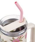 A matching white handle is oversized with finger grips for a more comfortable hold. The clear lid is BPA and phthalate-free and twists easily on and off. A white dial attached to the lid lets you choose how you drink, whether straight from the lid or with a straw. You can even close the lid off completely to prevent spilling. A reusable stainless steel straw with a pink silicone tip is also included.