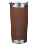 The exterior of this stainless steel mug is powder-coated in a deep brown color. A black mountain landscape decal is applied all around the bottom half of the mug. Intricate lines create the outlines of the peaks and ridges in the mountains, adding fine artistic detail to this mug. The sentiment is presented vertically above the mountain scene in a taupe-lettered decal.