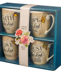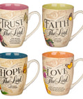 The mug set is decorated in rich colors that draw the eye to the sentiment, and the theme for the set is Christian values that define our relationship with God.