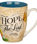 The third mug focus on the virtue of hope that inspires growth. This mug's Mediterranean blue interior invites quiet contemplation, and the exterior is decorated with blooming yellow marigolds and white lilies, honey-colored butterflies, and tan-colored carved leaves. The sentiment is presented on the front in black lettering. The sun-kissed scene continues on the back of the mug, where the sentiment is replaced with the Scripture reference.