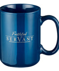 In an overture of simplicity and clean lines, this classic coffee mug is made of sturdy stoneware with a high gloss finish. It boasts the gilded quote of “Be strong and do not give up, for your work will be rewarded. 2 Chronicles 15:7” in metallic gold which stands out against the navy blue background while “Faithful Servant” appears in gold on the back. This Christian mug has the capacity of a generous 15 ounces and it comes with a coordinating gift box.