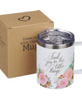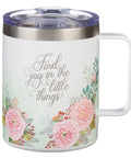 The Find Joy Pink Floral Camp-style Stainless Steel Mug is perfect for car trips, work commutes, or camping adventures. Keep your favorite drink hot or cold, and focus on the good things in life as you sip your drink on the go.