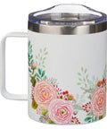 This double-wall insulated stainless steel mug is white on the top half and multicolored on the bottom as a garden scene with pink roses, green leaves, and other small colorful flowers spring up from its base. On the front, the sentiment is laser-engraved in silver cursive font.