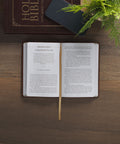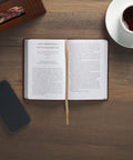 Brown topstitching along the rounded edges of the cover adds durability to the design, and golden gilt-edged page edges add an additional glimpse of gold. For your convenience, a satin ribbon marker that can be used to track your progress through the two-color printed devotional is attached to the book's spine.
