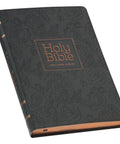 Large heat-debossed flowers are scattered across the front and back covers of the black faux leather Bible. A stunning copper-foiled frame announces the title and version reference in the same color foil.