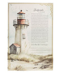 A majestic lighthouse on a sandy beach grabs your attention when you first look at the puzzle. Next to it is the beloved poem Footprints in the Sand. The entire scene is framed in a beautifully ornate gold-foiled frame.