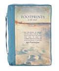 The cover of the Footprints Poly-canvas Value Bible Cover showcases a compelling visual representation of the iconic poem Footprints in the Sand, offering not just protection for your Bible but a constant reminder of God's abiding care.