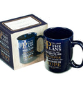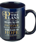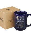 The Jeremiah 29:11 Mug is made of ceramic and has a solid navy blue design with the message from Jeremiah 29:11 in bold white and gold text.
