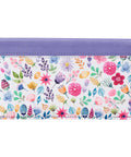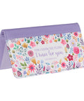 The Faux Leather Checkbook Cover is made of supple and scuff-resistant faux leather in two vivid tones: a happy turquoise and a bright floral-patterned white, stitched together at the spine with durable turquoise thread. The cover is smattered with fun watercolored flowers in an array of lively hues, emphasizing the swooping calligraphy of the Bible verse at the cover’s center. The verse is foiled in shining lavender.