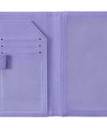 Topstitching externally lines the spine, sides, and rounded corners of the checkbook cover for long-lasting durability. Inside the checkbook cover is a slip pocket containing three additional slots for credit cards and a sheer I.D. holder, along with an elastic, looped pen-holder. A second slip pocket holds a checkbook, and a plastic divider is stitched along the bottom to avoid damaging the rest of the checkbook’s pages when carbon copies are made.