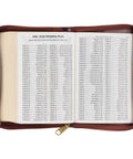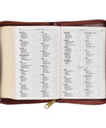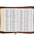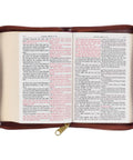 Because the 10-point text is formatted in double columns on each page, you won’t have to sacrifice readability with this compact Bible. In addition, the words of Christ are printed in red to stand out. You can keep your place easily with the attached brown satin ribbon marker, and a brown zipper with a gold zipper pull securely closes the Bible and keeps all your loose notes and bookmarks safe. Gold gilt-edged pages coordinate with the gold zipper pull and the gold-foiled cover design accents.