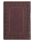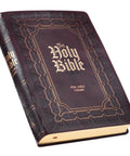 The super giant print Bible features smooth front and back faux leather covers adorned with exquisite gold-foiled frames. The design is further enhanced with Greek-themed heat-debossed fern and scroll work, lending a captivating depth to its appearance. The front cover showcases a gold-foiled title presented in a stylish Old English font, complemented by a heat-debossed design and the version reference.