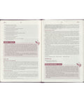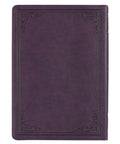 The front and back covers of the deep purple faux leather cover of the devotional Bible are heat-debossed with a frame that is accented with heat-debossed corner scroll designs.