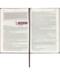 Inside the Bible, you'll find a comfortable 10-point font size that ensures that the text is both legible and easy on the eyes. Another feature that improves readability is the Smyth-sewn binding, which allows the Bible to open completely flat and expose all the text, making it a breeze to read across the lines. For visual interest, the text is printed in a tasteful combination of black and brown ink and organized in a single-column format. Additionally, a satin ribbon marker is included to help you keep track of your progress through the Bible, and silver gilt-edging on the page edges adds shimmer and protects against moisture. The Bible serves as a wonderful gift choice. To that end, there's a personalization page included in the front of the Bible. This page can be inscribed with a message to commemorate a special occasion to make it even more meaningful.