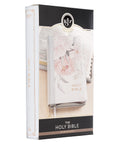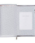 A gold metal cross-engraved zipper pull securely closes the silver-gray zipper on three sides of the Bible. Thumb indexing ensures that pages stay unruffled and makes navigation easy. Luxury features, such as a pink satin ribbon marker, gilt-edged pages, and a lay-flat spine, make the Bible a gift-worthy item. To ensure its safe delivery, the Bible is thoughtfully protected by a cardboard sleeve, ensuring its security during shipping and handling.