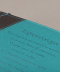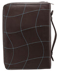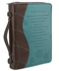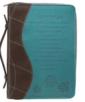 Un diseño bordado de olas cubre el suave cuero de color chocolate que envuelve la funda del centro hacia la parte trasera. Un cierre con un tirador de cremallera grabado con una cruz rodea la funda para un cerrado compacto. Esta funda también viene con una manija que permite que la funda y su Biblia puedan permanecer abiertas en forma plana. Dos lazos para bolígrafos o lápices se encuentran en el interior de cada panel. Esta funda para Biblias está disponible en dos tamaños: mediano y grande. Por favor consulte la última imagen disponible para ver las medidas de los distintos tamaños antes de hacer su selección. La funda moderna Esperanza de color turquesa es una gran forma de celebrar un cumpleaños espiritual o también como un regalo para una joven que ha sido bautizada y quiere mantener su Biblia segura.- Cuero sintético de color turquesa