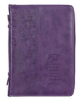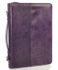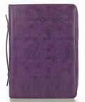 Esta llamativa funda está construida de un cuero duradero que se ve y se siente como cuero real. Tiene un tirador de cremallera grabado con una cruz y una manija especial en el lomo para que su Biblia pueda abrirse en forma plana. También provee dos lazos para bolígrafos en la parte interior. Esta funda para Biblias está disponible en tres tamaños: mediano, grande y extra grande. Por favor consulte la última imagen disponible en el mostrador para verificar las medidas de los diferentes tamaños antes de hacer su selección.Esta funda morada puede ser un gran regalo especial para una adolescente que acaba de ser bautizada o que ha hecho una profesión de fe. Esta funda no sólo protegerá su Biblia sino que también le recordará de su fe por muchos años.- Cuero sintético