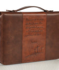 La funda para Biblias Porque tanto amó Dios al mundo de cuero sintético en dos tonos es un recordatorio de cuánto Dios ama al mundo.La tapa de esta funda de cuero sintético muestra dos paneles de color café oscuro con un panel de tono más claro en medio. Estos paneles envuelven la parte central de la funda. El panel central tiene un diseño en relieve con tres cruces y el versículo de Juan 3:16.