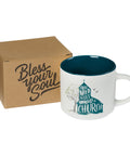A clean white exterior wraps the Get Yourself to Church Ceramic Coffee Mug and provides the backdrop for the design. The design features a tree leaning up against the teal silhouette of a church while birds fly off in the background. White lettering is superimposed on the teal church silhouette. The mug's interior is teal to match. When you're fully caffeinated, you'll see the Bless Your Soul imprint on the bottom of the cup.
