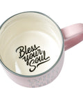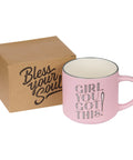 Based on a retro diner mug style, this ceramic mug in pretty pink stands out from the crowd. The sentiment on the Girl, You Got This mug is emblazoned on each side in black and white lettering. The interior is shaded a bright contrasting white, and a thin black rim runs around the mouth of the mug. When you finish your cup of deliciousness, you'll find a Bless Your Soul imprint right at the bottom of the mug for extra smiles.