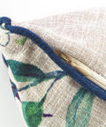 The pillow showcases lush greenery that is set against a taupe woven background. The greenery frames the rich teal embroidered letters that spell out the sentiment.