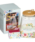A card pack holding 365 cards is included in the purchase. The cards are decorated with soft watercolored ranunculus blooms set against blue, pink, green, and purple pastel backgrounds. Each card features one of 12 verses that pertain to gratitude on the front and a lined back, decorated with a watermarked ranunculus design. Record your prayers, blessings, and gratitude on the cards and store them in the jar until you reach a special day, like an anniversary or New Year, to remind yourself how faithful and good the LORD has been to you. The tightfitting natural wood lid with its silicone seal and natural fiber loop will keep your cards safe against dust and moisture. Refill card packs are available, so you can start the process again after reading through all your cards.To keep the jar in tip-top shape, we recommend wiping it with a damp cloth when needed. Teach your students mindfulness when you start a gratitude tradition in your classroom or Sunday school classroom with the Give Thanks Pink Ranunculus Glass Gratitude Jar.- Clear glass with pink and blue ranunculus design