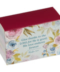 Savor the goodness of the LORD when you record your daily blessings and store them in the Give Thanks Pink Ranunculus Glass Gratitude Jar this year!The clear glass gratitude jar is decorated with a row of flowering ranunculus blooms in shades of pink and blue that wraps around its base. The sentiment is set atop the hedge of flowers and is presented in a soft blue color.