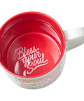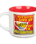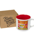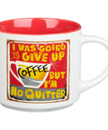 This white ceramic mug features a retro-style design printed on one side. The sentiment is framed as a vintage sign with a coffee cup accented with yellow and black lettering against a red background. The inside of the cup is a matching red and has a Bless Your Soul imprint at the bottom. Add some humor to your coffee routine with the Give Up Coffee Ceramic Coffee Mug!