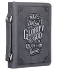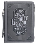 The shark gray faux leather Bible cover is heat-debossed with a double frame with corner scroll designs. The frame's interior is texturized with a heat-debossed wave pattern surrounding the sentiment that is presented in a silver-foiled typographical design. The sentiment is inspired by the first question of the Westminster Catechism: What is the chief end of man?