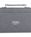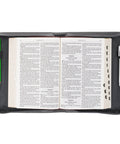 When the cover is open, a gray faux-leather handle, attached to the spine with silver hardware, folds completely flat to ensure the Bible opens completely.