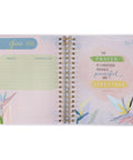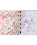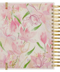 A pale pink background with a calming tulip floral design decorates this planner's front and back covers. Pink watercolor petals and green leaves overlaid with pink and gold-foiled flower outlines provide peaceful scenery for the covers. The sentiment is presented in fuchsia pink and gold-foiled letters.