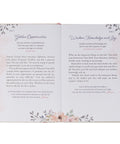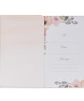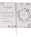 The floral theme continues to the interior of the devotional, where full-color designs decorate the bottom and top corners of each page. The page edges are gilt-edged in a coordinating rose gold foil, and a satin ribbon marker is included to mark your progress through the book.