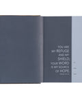 The Bible's cover design is divided into two sections: the upper block showcases a breathtaking mountain vista bathed in the golden rays of the sun. In contrast, the lower block features a navy background trimmed with a gold-foiled geometric triangle pattern. In the center, a blue frame with a gold-foiled border displays the title.