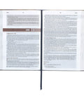 A presentation page that can be personalized to commemorate a special occasion welcomes you to the interior of the devotional Bible. This feature makes the Bible a good gift choice. Throughout the two-color Bible, the text is printed in black and brown and organized in a single-column layout. A satin ribbon marker is included to track your progress, and the lay-flat Smyth-sewn binding ensures that all the text is easily visible.