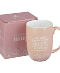 The 15-fluid-ounce mug has a crisp white interior and a large D-shaped handle. It has a rounded bottom and comes packaged in a pink tuck-top box. This large-capacity mug is a sustainable choice, so ditch your disposal coffee cups and opt for a beautiful, inspirational, and reusable ceramic mug.