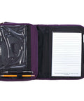When you unsnap the closure and open the front panel, you will find an interior Bible case and a notebook with a highlighter. The Bible case has two slip pockets to hold your Bible securely. A heavy-duty gold metal zipper and zipper pull offer a smooth closure while a teal faux leather tassel gives you a good grip. A mini slip pocket attached to the interior slip pocket is a good place to keep Kleenex, folded up church bulletin, or your cell phone. On the outside of the interior Bible case panel, you will find two pen loops and an attached clear plastic case with a black zippered closure that doubles as a pencil case or cell phone pouch. The opposite panel has an included notepad and pen highlighter held by a pen loop.This Bible cover is available in two sizes: medium and large. Please refer to the last image in the image carousel on the left for the Bible Cover Sizing Chart before you make a selection.Do you know a seriously organized woman in need of a Bible case? Then this tri-fold organizer is for her. Or, do you know someone that needs to be more organized? Give her the gift of organization with the Grace Purple Tri-fold Organizer Bible Cover.- Purple Polyester Organizer