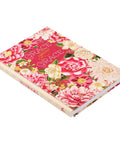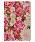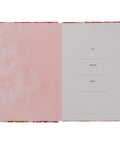 The journal boasts a vintage-looking cover filled with oversized embossed pink-toned florals and blush pink linen spine. The rich pink and ivory flowers overlap in swaths that converge in a rose pink vignette that holds the gold-foiled title.